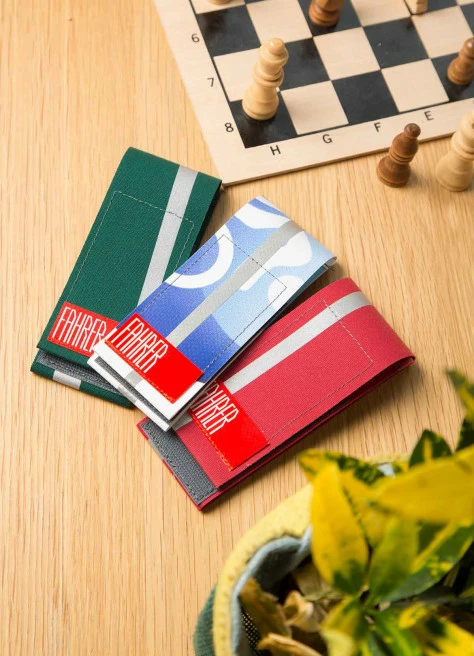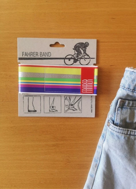Chaque pince pantalon est conçu et fabriqué à la main à Berlin. Production réalisée en collaboration avec des ateliers pour personnes handicapées. À l’origine, il s’agissait alors de banderoles publicitaires, de bâches de camions et de bâches de bateaux. Ils mènent désormais une seconde vie passionnante à la jambe des cyclistes. Ce concept de recyclage durable fait partie de la conviction de Fahrer et est ainsi partagée par JE SUIS À VÉLO.